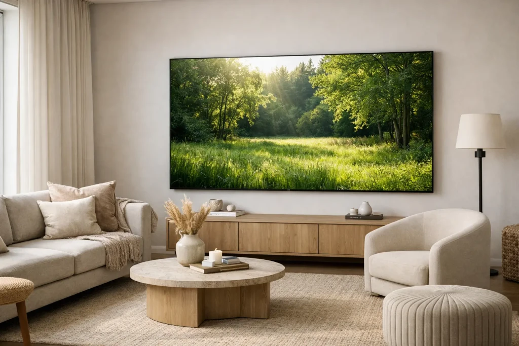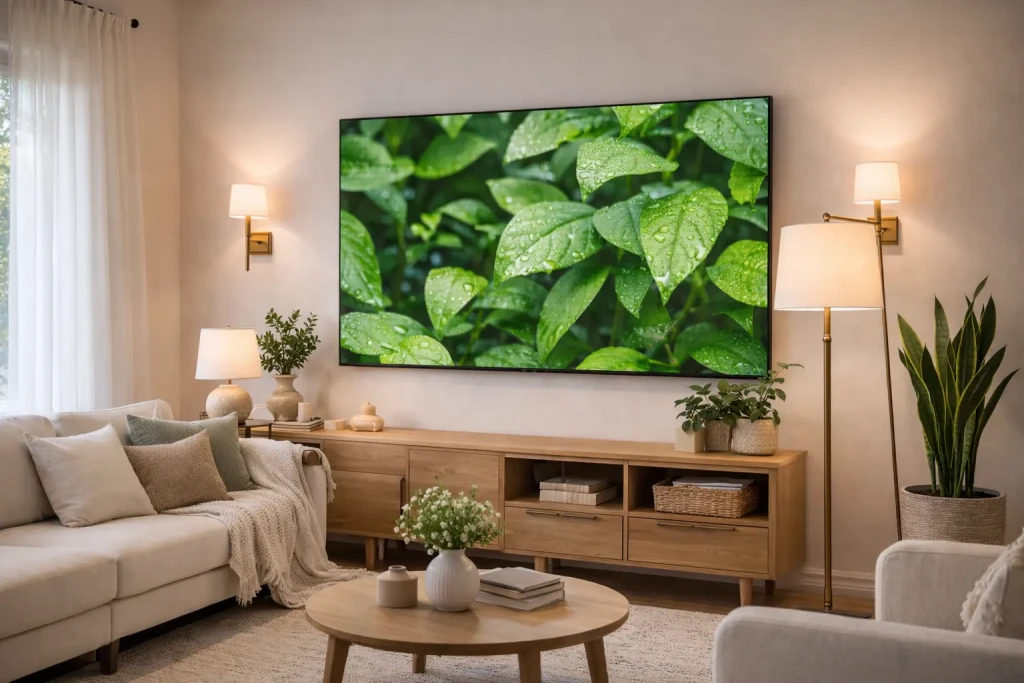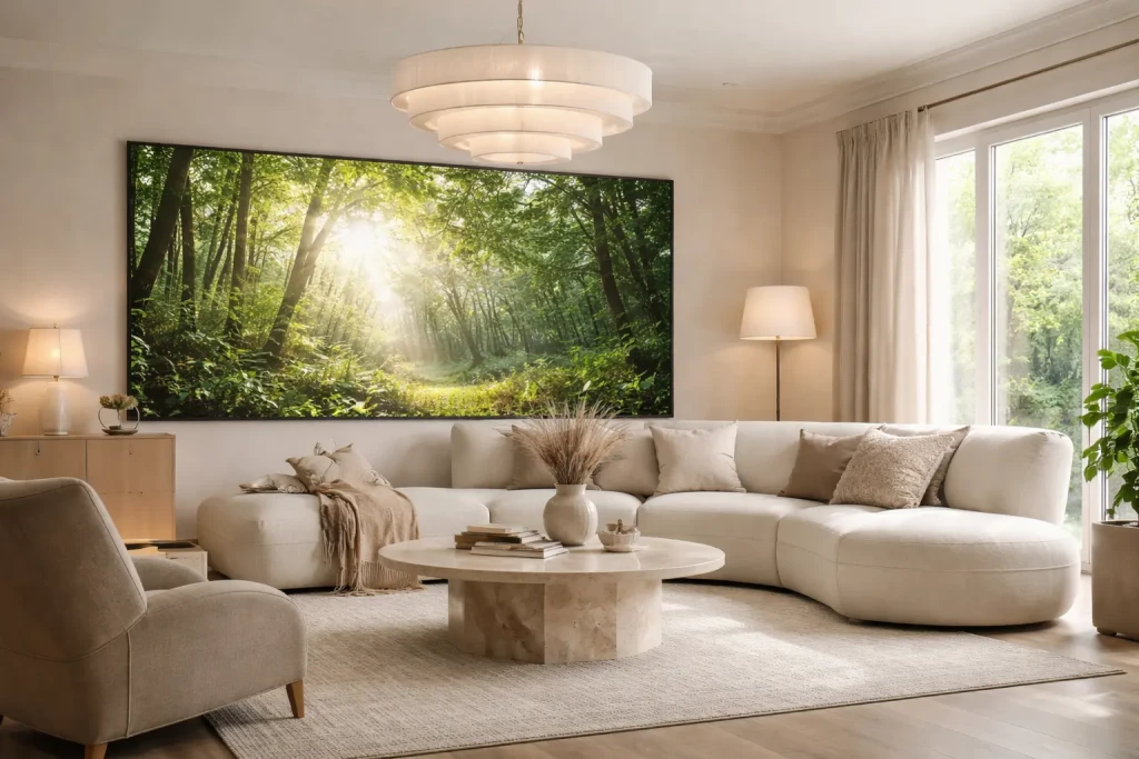 Imagine a sleek mounted LED panel displaying serene forest visuals. It doubles as art and atmosphere.