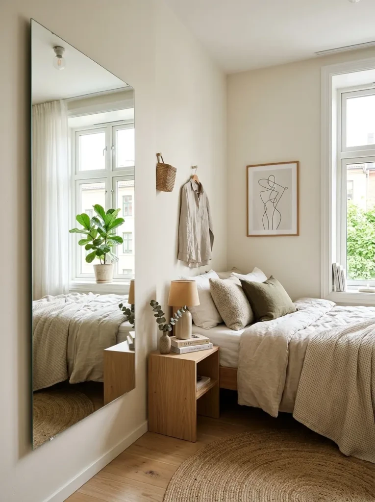Mirrors are honestly a cheat code. Place a large mirror opposite a window, and suddenly your room looks twice as big.