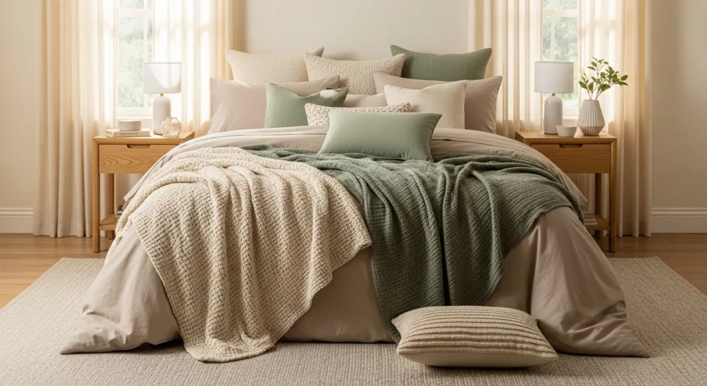 Textures like linen, wool, and cotton create a balanced bedroom decor aesthetic.