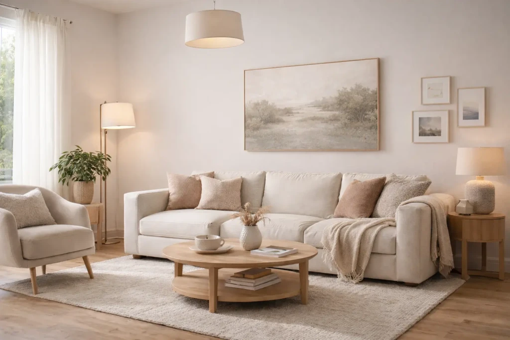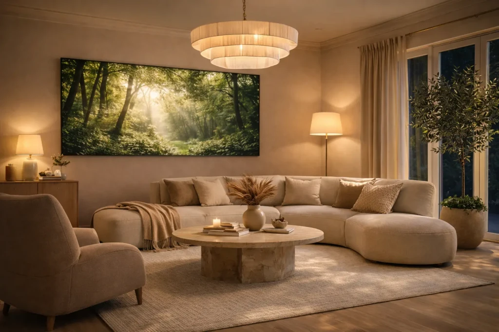 Warm lighting makes your living room aesthetic feel cozy instead of sterile.