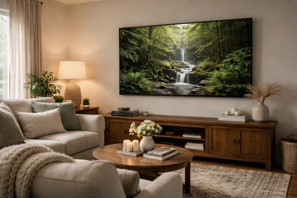 One of my favorite tricks lately? A sleek wall-mounted LED screen that shows calming green scenery. Think forests, waterfalls, or soft green landscapes. Yes — I mean living room inspiration add wall LED screen show green greess vibes.