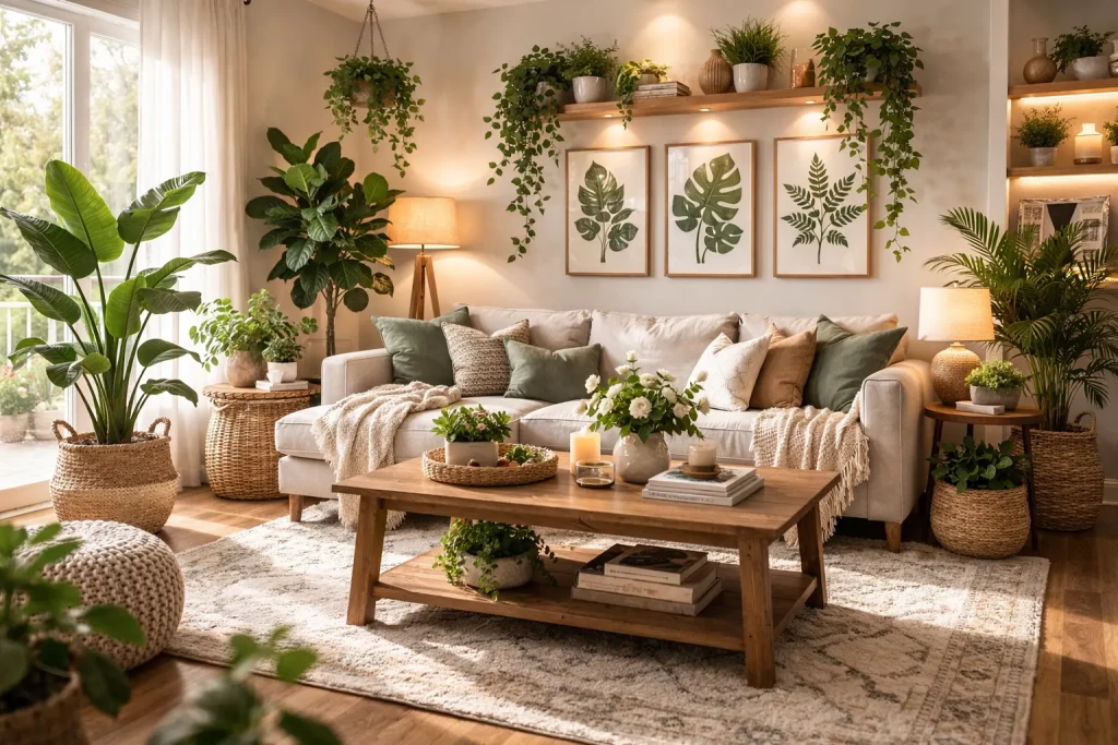 Cluster different heights together. Use woven baskets or ceramic pots. Suddenly your living room decor looks curated instead of random.